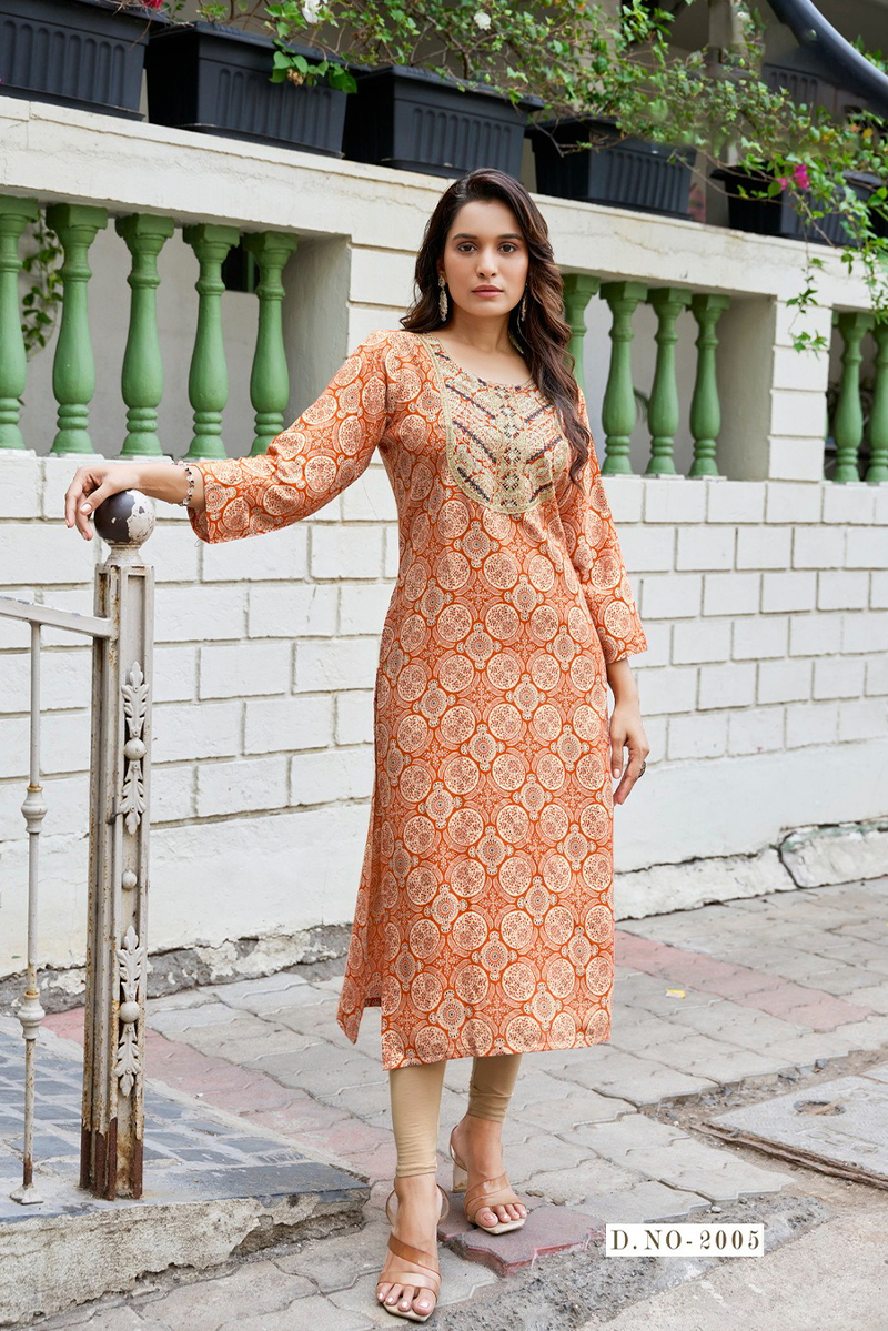 Embroidered Rayon Foil Print Kurti - LTT18 Orange with Floral print