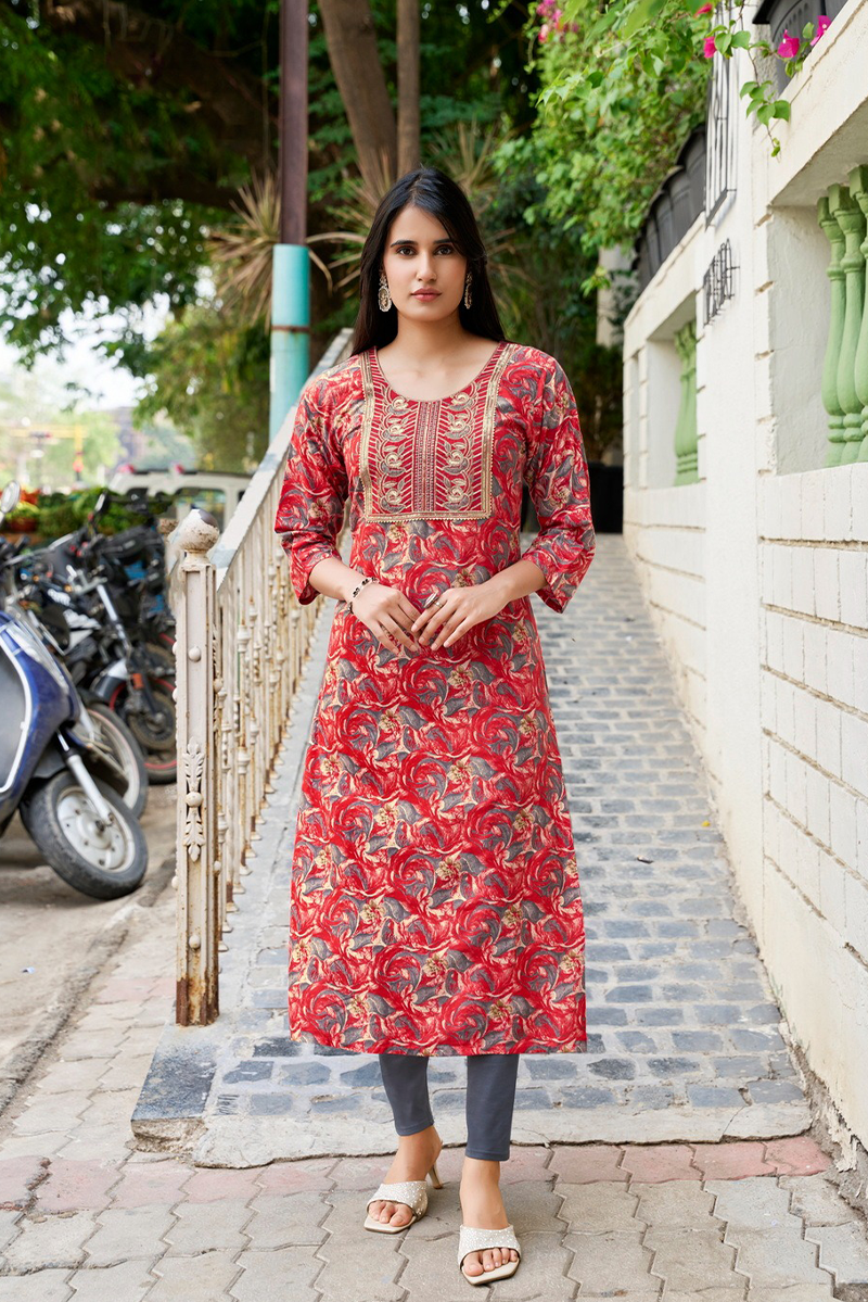 Embroidered Rayon Foil Print Kurti - LTT20 Red with Floral print