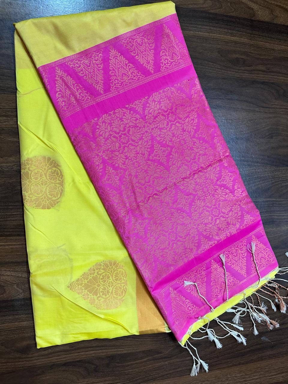 Fancy Soft Silk Bhutta Saree - LTS47 Canary Yellow & Hot Pink
