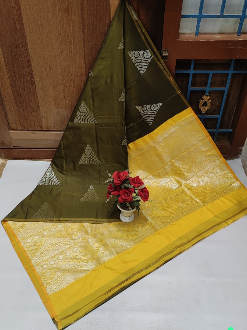 Fancy Soft Silk Butta Saree - Depp Olive Green And Yellow