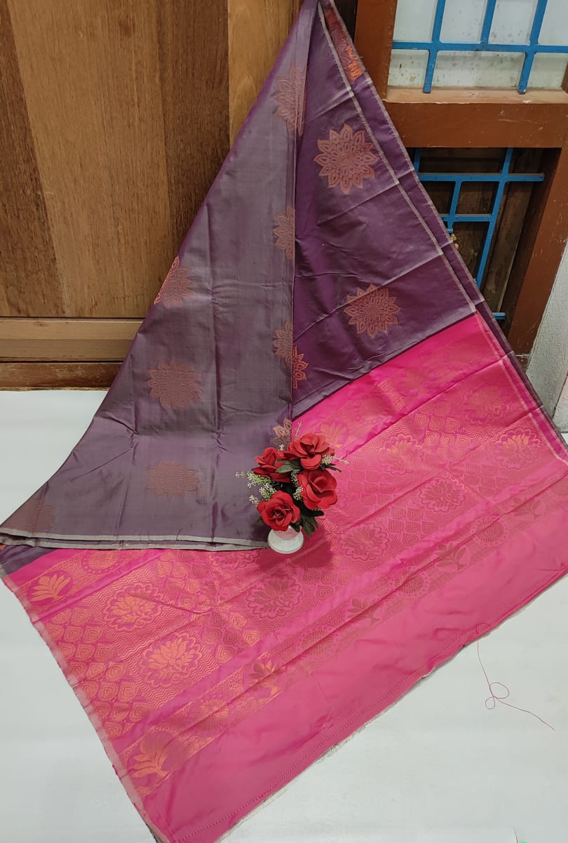 Fancy Soft Silk Butta Saree - Greyish Lavender And Pink