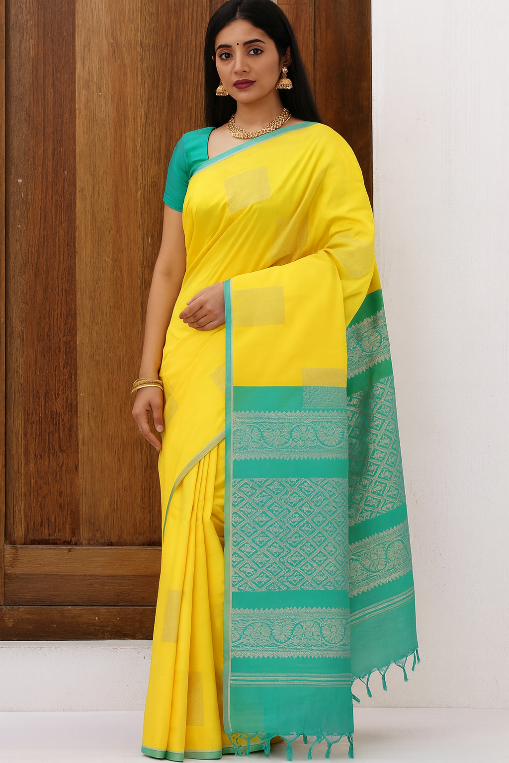 Fancy Soft Silk Saree Butta - Yellow And Seablue Share WhatsApp Deel X Pin it Messenger Email Fancy Soft Silk Saree Butta - Yellow And Seablue Share WhatsApp Deel X Pin it Messenger Email Product form Free pickup in our shop(s) Free pickup in our shop(s) Rs. 1,599.00 Description Soft and smooth woven fabric with rich traditional motifs Elegant body featuring small buttas placed in a classic pattern Beautiful pallu with intricate jacquard work for a grand look Lightweight drape suitable for festive and special occasions Traditional border crafted with fine zari detailing Comes with matching blouse material attached Quantity Add to cart Fabric: Soft SIlkWash Care: Hand Wash Only