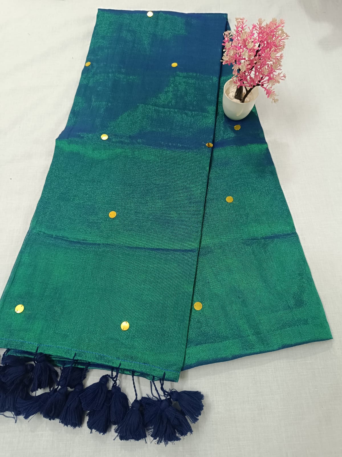 Premium Quality Raga Tissue Soft Silk Saree - LTS142 Green & Teal Mix Share WhatsApp Deel X Pin it Messenger Email Premium Quality Raga Tissue Soft Silk Saree - LTS142 Green & Teal Mix Share WhatsApp Deel X Pin it Messenger Email Product form Free pickup in our shop(s) Free pickup in our shop(s) Rs. 1,199.00 Description Subtle glossy/shiny texture. Small golden sequins scattered throughout. Navy blue tassels on the edges. Watercolor-style blended design pattern. Soft and lightweight feel. Suitable for ethnic outfits and festive wear. With blouue Quantity Add to cart Fabric: Soft Wash Care: Hand Wash Only