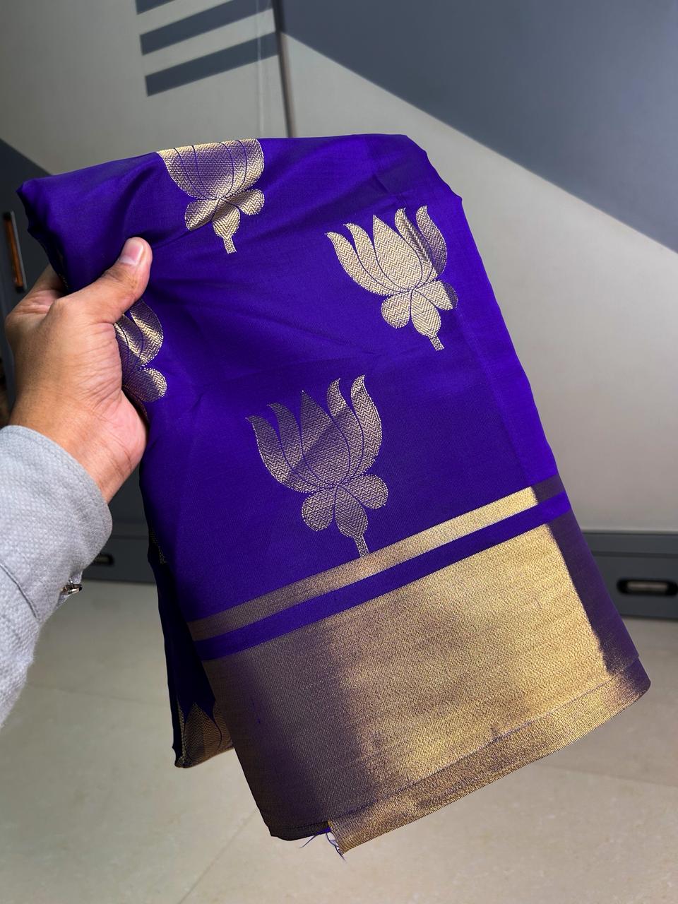 Elegant soft silk-blend saree designed with woven lotus motifs all over the body