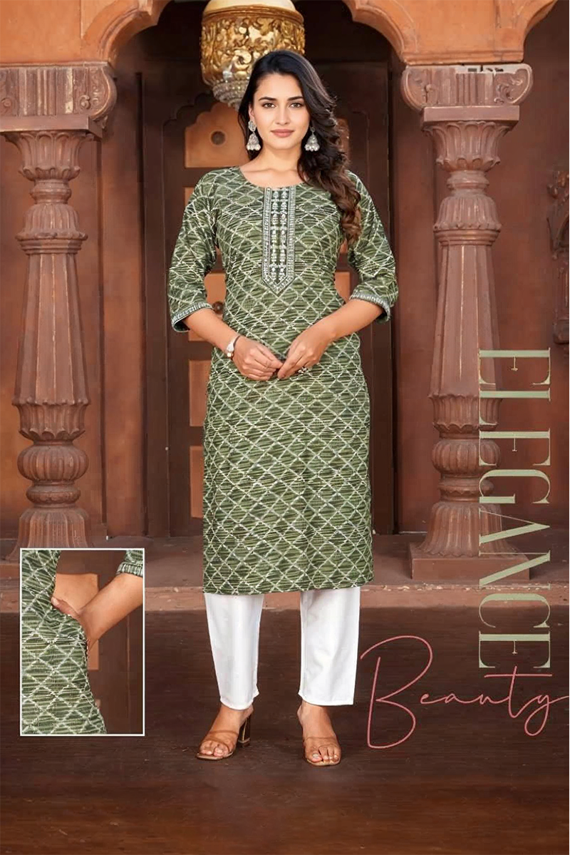 Stylish printed kurti in heavy rayon fabric with side pocket. Comes with cotton pant. Perfect for daily and casual wear.