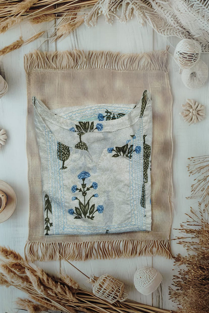 A lightweight cotton kurta featuring an off-white base with hand-block style floral and vase motifs in green and blue. Designed with a straight cut