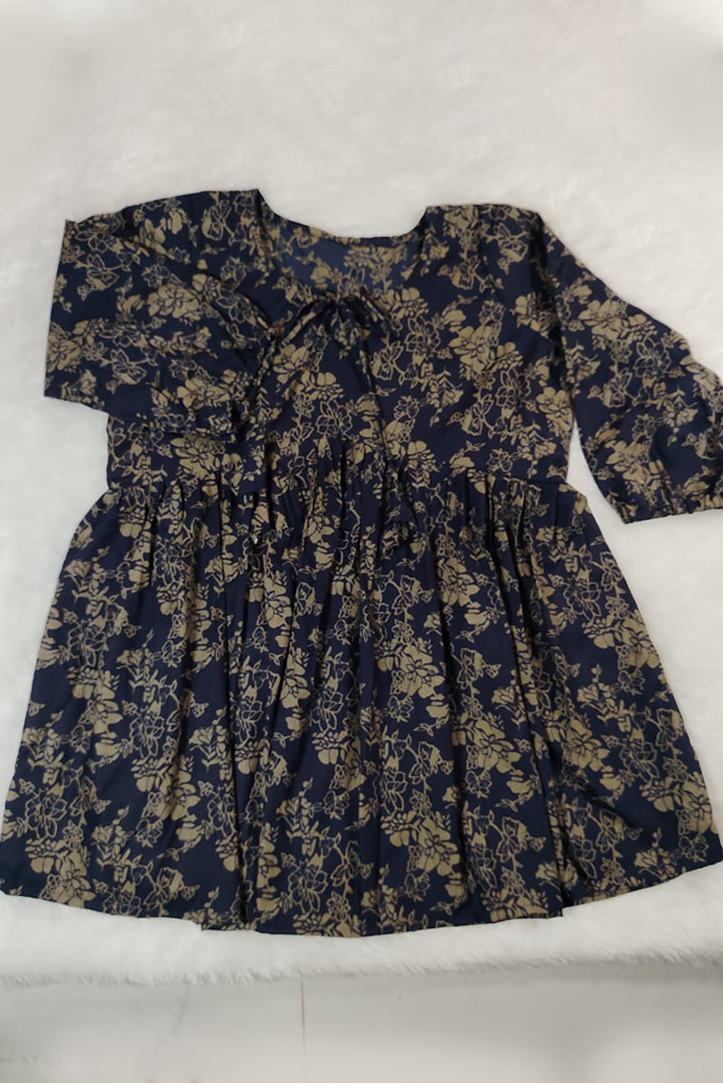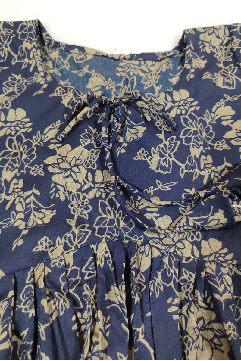 Made from lightweight, comfortable fabric, it features a timeless navy blue base adorned with a delicate beige floral pattern