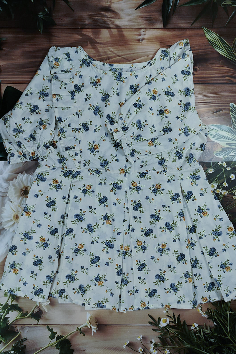 A charming white frock adorned with delicate blue and yellow floral prints. Features puff sleeves with ruffle accents on the bodice and a flared pleated design for a cute and stylish look.